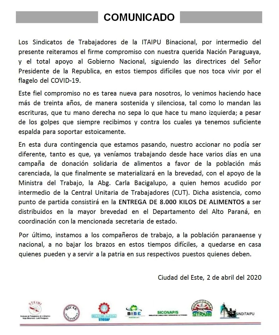 El STEIBI, conjuntamente con otros seis sindicatos que nuclean a los trabajadores paraguayos de la empresa Itaipú Binacional hemos emitido un nuevo comunicado a la opinión pública, reiterando nuestro firme compromiso con el pueblo paraguayo y demostrando nuestra mayor predisposición a la cooperación solidaria con nuestras familias, nuestro pueblo y nuestra nación.